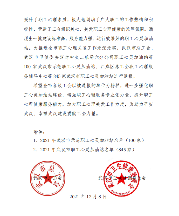 克日,,,,武汉市总工会和武汉市卫生康健委员会联合发文转达了2021年度武汉市职工心灵加油站事情情形,,,,工业园公司荣获“2021年度武汉市职工心灵加油站”称呼!